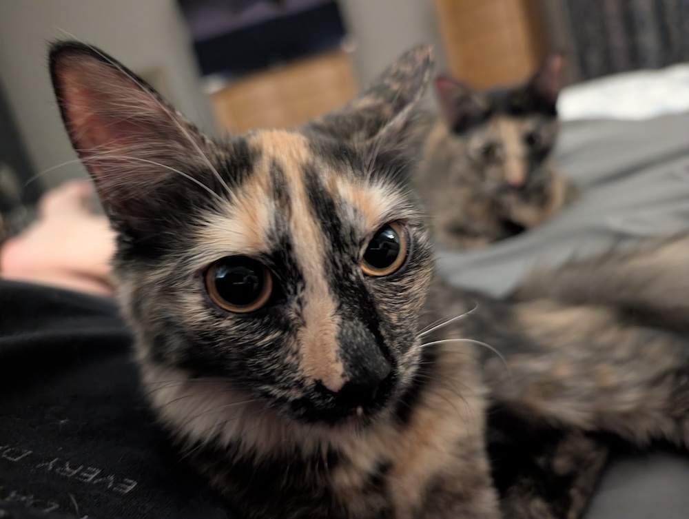 But there's a reason that we don't give them names, so we don't get attached. These tiny ladies hiss and posture their little faces toward Remy. I know, karma, right? While it's funny now, when they get bigger, I worry about genuine conflict. It's a red flag, and it's a serious bummer. We also would really like to see a cat or two that really warms up to Poe, who sometimes seems a little lost without his bro. Poe seemed recreationally interested in them, and they were recreationally interested in him, but it was not a love fest.